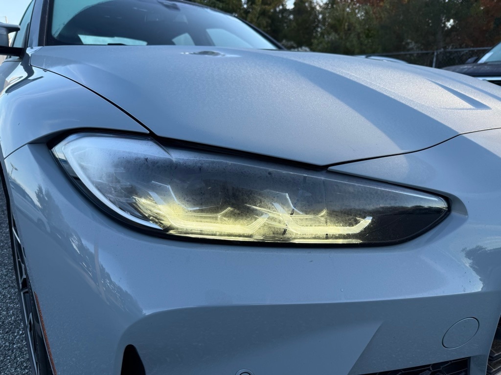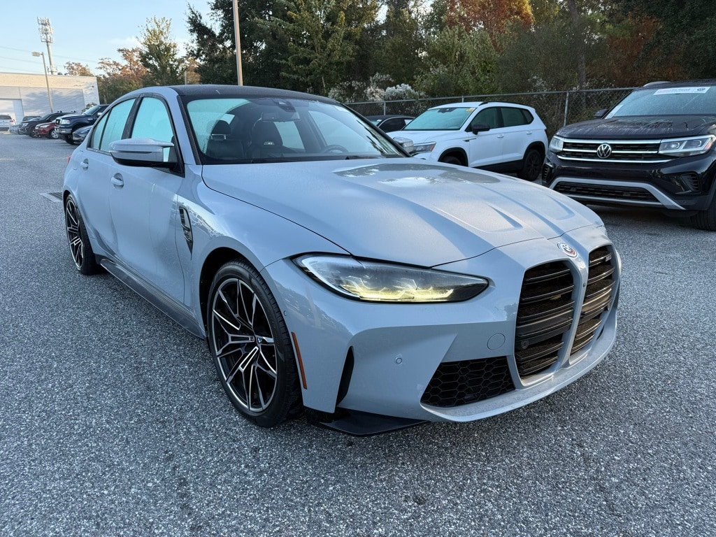This M3 is well equipped with Connected Package Pro, Executive Package (BMW Curved Display w/HUD, Heated Steering Wheel, Power Tailgate, and SensaTec Dashboard), Parking Assistance Package (Parking Assistant Plus), Navigation System, 16 Speakers, 4-Wheel Disc Brakes, ABS brakes, Adaptive suspension, Air Conditioning, Alloy wheels, AM/FM radio: SiriusXM, Apple CarPlay & Android Auto Compatibility, Auto High-beam Headlights, Auto-dimming door mirrors, Auto-dimming Rear-View mirror, Automatic temperature control, BMW Assist eCall, BMW Curved Display, BMW TeleServices, Brake assist, Bumpers: body-color, Compass, ConnectedDrive Services, Delay-off headlights, Driver door bin, Driver vanity mirror, Dual front impact airbags, Dual front side impact airbags, Electronic Stability Control, Emergency communication system: BMW Assist eCall, Enhanced USB & Bluetooth Plus Smartphone Integration, Extended Merino Leather Upholstery, Exterior Parking Camera Rear, Four wheel independent suspension, Front anti-roll bar, Front Bucket Seats, Front Center Armrest, Front dual zone A/C, Front reading lights, Fully automatic headlights, Garage door transmitter, harman/kardon Surround Sound System, harman/kardon® Speakers, Heated door mirrors, Heated Front Seats, Heated front seats, Illuminated entry, Knee airbag, Leather Shift Knob, Low tire pressure warning, Lumbar Support, M Sport Seats, Memory seat, Occupant sensing airbag, Outside temperature display, Overhead airbag, Panic alarm, Passenger door bin, Passenger vanity mirror, Power door mirrors, Power driver seat, Power Front Seats, Power passenger seat, Power steering, Power windows, Radio data system, Radio: AM/FM Audio System, Rain sensing wipers, Rear air conditioning, Rear anti-roll bar, Rear reading lights, Rear window defroster, Remote keyless entry, Security system, SiriusXM Satellite Radio w/1 Year Subscription, Speed control, Speed-sensing steering, Speed-Sensitive Wipers, Split folding rear seat, Spoiler, Sport steering wheel, Steering wheel mounted audio controls, Tachometer, Telescoping steering wheel, Tilt steering wheel, Traction control, Trip computer, Turn signal indicator mirrors, Variably intermittent wipers, Wheels: 18"x9.5" Fr. & 19"x10.5"Rr. M Orbit Gray, and Wheels: 19"x9.5" Fr. & 20"x10.5" Rr. M Bi-color.