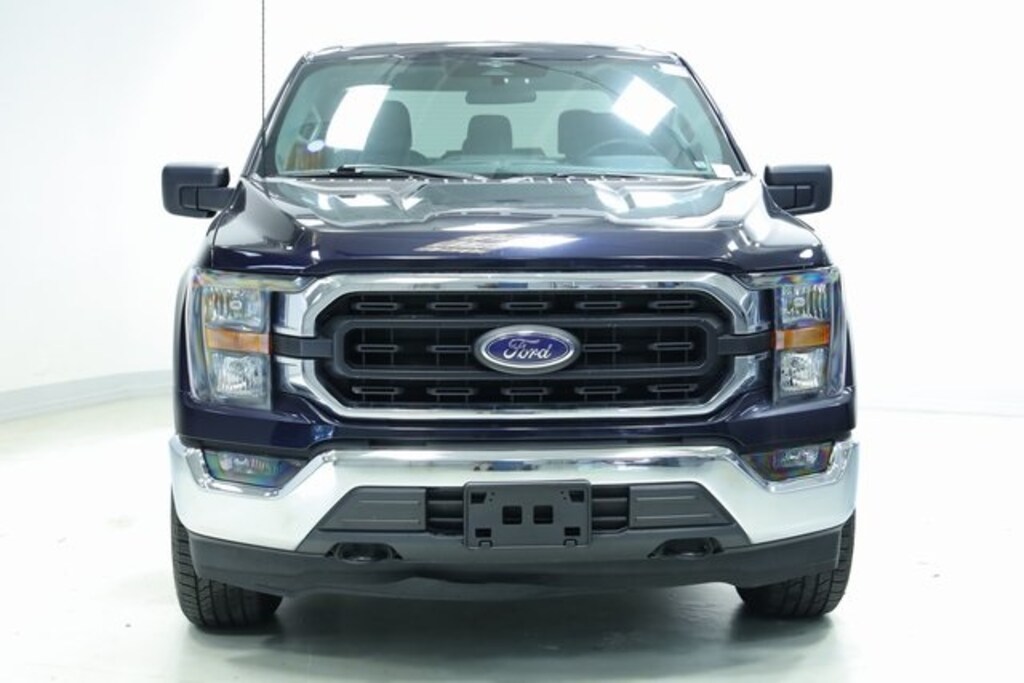 This F-150 is well equipped with F-150 XLT, 4D SuperCrew, 5.0L V8, 10-Speed Automatic, Blue Metallic, Black W/Medium Dark Slate Cloth, 6 Speakers, Air Conditioning, Brake assist, Electronic Stability Control, Exterior Parking Camera Rear, Illuminated entry, Panic alarm, Power door mirrors, Power windows, Radio data system, Radio: AM/FM Stereo w/6 Speakers, Rear step bumper, Security system, SYNC 4, 18" Silver Painted Aluminum Wheels, 3.31 Axle Ratio, 4 Key Lockset w/PEG and RKE, 4-Wheel Disc Brakes, 8-Way Power Driver's Seat w/Power Lumbar, ABS brakes, Alloy wheels, AM/FM radio, Auto High-beam Headlights, Bumpers: chrome, Cloth 40/20/40 Front Seat, Compass, Delay-off headlights, Driver door bin, Driver vanity mirror, Dual front impact airbags, Dual front side impact airbags, Emergency communication system: SYNC 4 911 Assist, Front anti-roll bar, Front Center Armrest w/Storage, Front fog lights, Front License Plate Bracket, Front reading lights, Front wheel independent suspension, Fully automatic headlights, Heated door mirrors, Low tire pressure warning, Occupant sensing airbag, Outside temperature display, Overhead airbag, Overhead console, Passenger door bin, Passenger vanity mirror, Power steering, Rear reading lights, Rear window defroster, Remote keyless entry, Speed control, Speed-sensing steering, Split folding rear seat, Steering wheel mounted audio controls, Tachometer, Telescoping steering wheel, Tilt steering wheel, Traction control, Trip computer, Variably intermittent wipers, Voltmeter, and Wheels: 17" Silver Painted Aluminum.