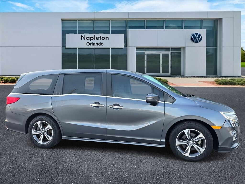 This Odyssey is well equipped with A/V remote, Air Conditioning, CD player, Dual front impact airbags, Emergency communication system: HondaLink, Four wheel independent suspension, Front dual zone A/C, Knee airbag, Memory seat, Navigation system: Honda Satellite-Linked Navigation System, Outside temperature display, Passenger vanity mirror, Power steering, Radio data system, Rear seat center armrest, Remote keyless entry, Telescoping steering wheel, 18" Machine-Finished Alloy Wheels, 3.61 Axle Ratio, 3rd row seats: split-bench, 4-Wheel Disc Brakes, 7 Speakers, ABS brakes, Alloy wheels, AM/FM radio: SiriusXM, Anti-whiplash front head restraints, Apple CarPlay/Android Auto, Auto High-beam Headlights, Auto-dimming Rear-View mirror, Automatic temperature control, Blind Spot Information (BSI) System warning, Brake assist, Bumpers: body-color, Compass, Delay-off headlights, Driver door bin, Driver vanity mirror, Driver's Seat Mounted Armrest, Dual front side impact airbags, DVD-Audio, Electronic Stability Control, Exterior Parking Camera Rear, Front anti-roll bar, Front Bucket Seats, Front fog lights, Front reading lights, Fully automatic headlights, Garage door transmitter: HomeLink, Headphones, Heated door mirrors, Heated Front Bucket Seats, Heated front seats, Illuminated entry, Leather Seat Trim, Leather steering wheel, Low tire pressure warning, Occupant sensing airbag, Overhead airbag, Overhead console, Panic alarm, Passenger door bin, Passenger seat mounted armrest, Power door mirrors, Power driver seat, Power Liftgate, Power moonroof, Power passenger seat, Power windows, Radio: 160-Watt AM/FM/HD/SiriusXM Audio System, Rear air conditioning, Rear anti-roll bar, Rear audio controls, Rear reading lights, Rear window defroster, Rear window wiper, Reclining 3rd row seat, Security system, Speed control, Speed-sensing steering, Speed-Sensitive Wipers, Split folding rear seat, Spoiler, Steering wheel mounted audio controls, Tachometer, Tilt steering wheel, Traction control, Trip computer, Turn signal indicator mirrors, and Variably intermittent wipers.
