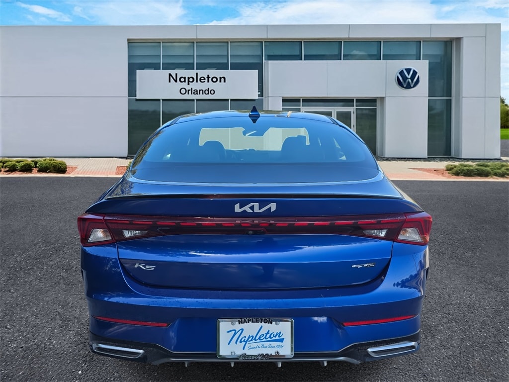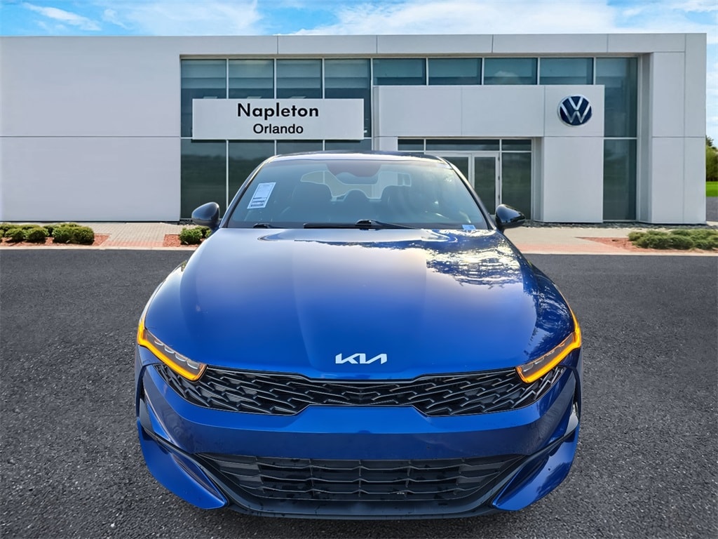 This K5 is well equipped with K5 GT-Line, 4D Sedan, I4, 8-Speed Automatic, FWD, Sapphire Blue, Black Cloth, 6 Speakers, Air Conditioning, Alloy wheels, Automatic temperature control, Brake assist, Bumpers: body-color, Cargo Mat, Delay-off headlights, Driver door bin, Dual front side impact airbags, Four wheel independent suspension, Front fog lights, Knee airbag, Navigation System, Overhead airbag, Overhead console, Power steering, Radio data system, Radio: AM/FM/MP3 Audio System, Rear anti-roll bar, Rear seat center armrest, Rear window defroster, Remote keyless entry, Security system, Steering wheel mounted audio controls, Telescoping steering wheel, Traction control, Trip computer, Variably intermittent wipers, 4-Wheel Disc Brakes, ABS brakes, AM/FM radio: SiriusXM, Apple CarPlay & Android Auto, Auto High-beam Headlights, Cargo Net, Carpeted Floor Mats, Cloth/Leatherette Seat Trim, Driver vanity mirror, Dual front impact airbags, Electronic Stability Control, Front anti-roll bar, Front Bucket Seats, Front Center Armrest, Front dual zone A/C, Front reading lights, Fully automatic headlights, Heated door mirrors, Illuminated entry, Low tire pressure warning, Occupant sensing airbag, Outside temperature display, Panic alarm, Passenger door bin, Passenger vanity mirror, Power door mirrors, Power driver seat, Power windows, Rear side impact airbag, Speed control, Speed-sensing steering, Split folding rear seat, Spoiler, Sport steering wheel, Tachometer, Tilt steering wheel, Turn signal indicator mirrors, and Wheels: 7.5J x 18" Gloss Black Machined Finish Alloy.