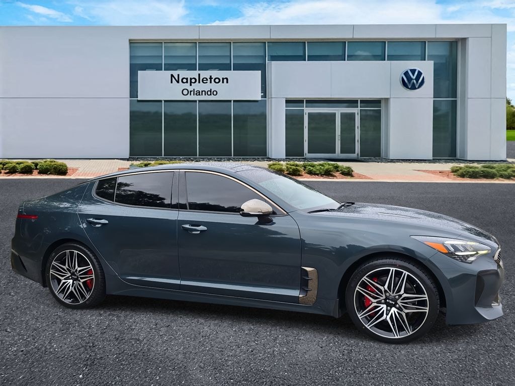 This Stinger is well equipped with ABS brakes, AM/FM radio: SiriusXM, Anti-whiplash front head restraints, Apple CarPlay & Android Auto, Auto High-beam Headlights, Automatic temperature control, Brake assist, Bumpers: body-color, Delay-off headlights, Dual front side impact airbags, Four wheel independent suspension, Front Center Armrest, Heated front seats, Knee airbag, Navigation System, Outside temperature display, Overhead airbag, Passenger vanity mirror, Power door mirrors, Power passenger seat, Power windows, Radio: AM/FM/HD Audio System, Rear air conditioning, Rear window defroster, Smart Key w/ Push Button and Remote Start, Speed-sensing steering, Speed-Sensitive Wipers, Wheels: 8.0J x 19 Front/8.5J x 19 Rear Alloy, 4-Wheel Disc Brakes, 9 Speakers, Air Conditioning, Alloy wheels, Auto-dimming Rear-View mirror, Carpeted Floor Mat, Driver door bin, Driver vanity mirror, Dual front impact airbags, Electronic Stability Control, Emergency communication system: UVO eServices, Exterior Parking Camera Rear, Front anti-roll bar, Front Bucket Seats, Front dual zone A/C, Front reading lights, Fully automatic headlights, harman/kardon® Speakers, Heated door mirrors, Heated Front Bucket Seats, Illuminated entry, Leather Seat Trim, Low tire pressure warning, Mud Guards, Occupant sensing airbag, Overhead console, Panic alarm, Passenger door bin, Power driver seat, Power moonroof, Power steering, Rain sensing wipers, Rear anti-roll bar, Rear reading lights, Rear seat center armrest, Remote keyless entry, Security system, Speed control, Split folding rear seat, Sport steering wheel, Steering wheel mounted audio controls, Tachometer, Telescoping steering wheel, Tilt steering wheel, Traction control, Trip computer, Turn signal indicator mirrors, and Variably intermittent wipers.
