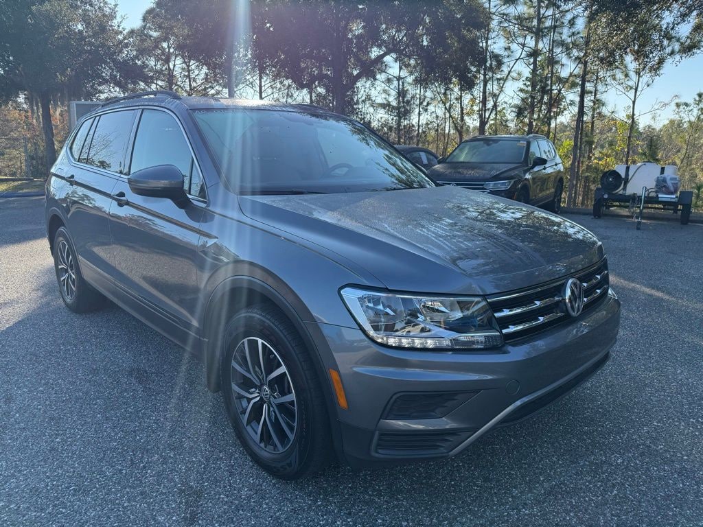 This Tiguan is well equipped with 3.33 Axle Ratio, 3rd row seats: bench, 4-Wheel Disc Brakes, 4-Wheel Independent Suspension, 6 Speakers, ABS brakes, Air Conditioning, Alloy wheels, AM/FM radio: SiriusXM, Automatic temperature control, Brake assist, Bumpers: body-color, Compass, Delay-off headlights, Driver door bin, Driver vanity mirror, Dual front impact airbags, Dual front side impact airbags, Electronic Stability Control, Exterior Parking Camera Rear, Forward collision: FCW w/Autonomous Emergency Braking mitigation, Four wheel independent suspension, Front anti-roll bar, Front Bucket Seats, Front Center Armrest, Front dual zone A/C, Front reading lights, Fully automatic headlights, Heated door mirrors, Heated Front Comfort Seats, Heated front seats, Illuminated entry, Leather Shift Knob, Low tire pressure warning, Occupant sensing airbag, Outside temperature display, Overhead airbag, Overhead console, Panic alarm, Passenger door bin, Passenger vanity mirror, Perforated V-Tex Leatherette Seating Surfaces, Power door mirrors, Power driver seat, Power steering, Power windows, Radio data system, Radio: Composition Media AM/FM/HD, Rear anti-roll bar, Rear reading lights, Rear seat center armrest, Rear window defroster, Rear window wiper, Remote CD player, Remote keyless entry, Roof rack: rails only, Security system, Speed control, Speed-sensing steering, Split folding rear seat, Spoiler, Steering wheel mounted audio controls, Tachometer, Telescoping steering wheel, Tilt steering wheel, Traction control, Trip computer, Turn signal indicator mirrors, Variably intermittent wipers, and Wheels: 17" Wide Multi-Spoke 2-Tone Alloy.