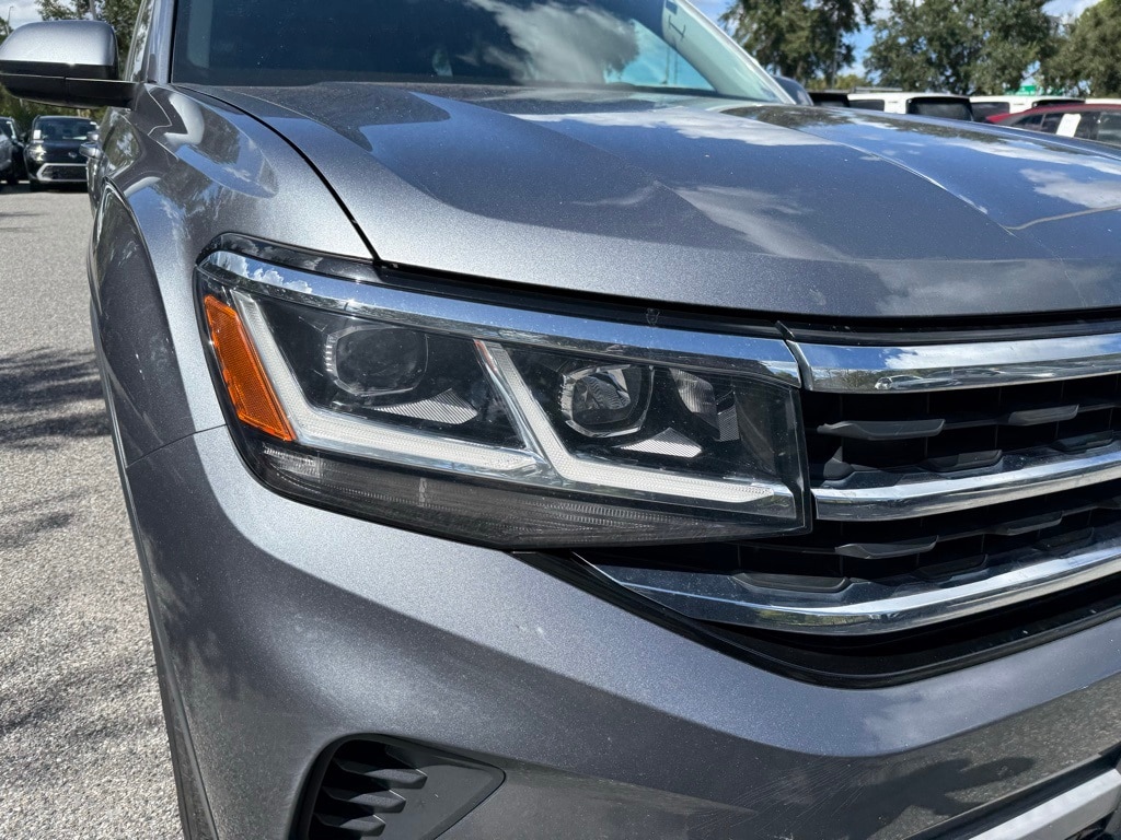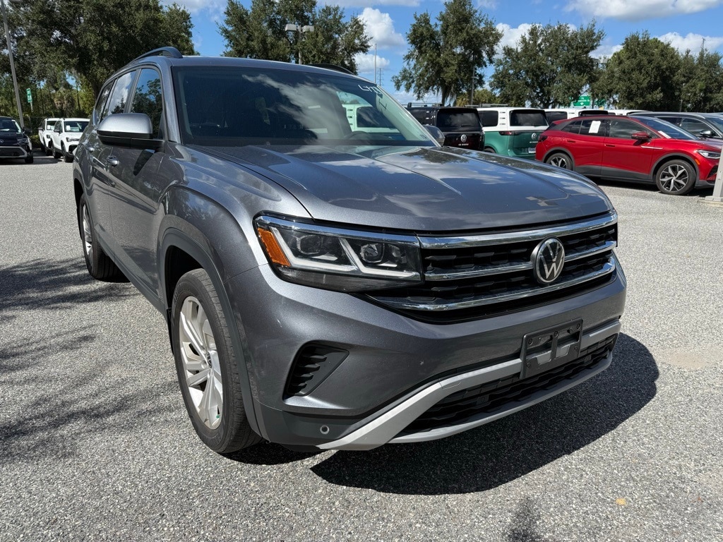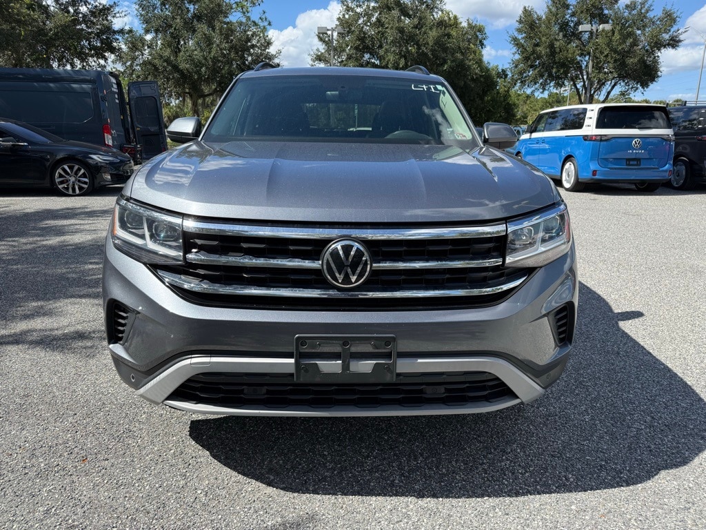 This Atlas is well equipped with Panoramic Sunroof Package (Panoramic Sunroof), Automatic temperature control, Delay-off headlights, Dual front side impact airbags, Emergency communication system: VW Car-Net services (capabilities require enrollment or subscription), Front dual zone A/C, Fully automatic headlights, Outside temperature display, Overhead console, Power driver seat, Power windows, Radio data system, Rear anti-roll bar, Security system, Speed control, Speed-sensing steering, Spoiler, Tachometer, Tilt steering wheel, Traction control, 3.60 Axle Ratio, 3rd row seats: split-bench, 4-Wheel Disc Brakes, 6 Speakers, ABS brakes, Air Conditioning, Alloy wheels, Auto-dimming Rear-View mirror, Brake assist, Bumpers: body-color, Compass, Driver door bin, Driver vanity mirror, Dual front impact airbags, Electronic Stability Control, Exterior Parking Camera Rear, Forward collision: FCW w/Autonomous Emergency Braking mitigation, Four wheel independent suspension, Front anti-roll bar, Front Bucket Seats, Front Center Armrest, Front fog lights, Front reading lights, Heated Comfort Front Bucket Seats, Heated door mirrors, Heated front seats, Illuminated entry, Leather Shift Knob, Low tire pressure warning, Occupant sensing airbag, Overhead airbag, Panic alarm, Passenger door bin, Passenger vanity mirror, Perforated V-Tex Leatherette Seating Surfaces, Power door mirrors, Power Liftgate, Power steering, Rain sensing wipers, Rear air conditioning, Rear reading lights, Rear seat center armrest, Rear window defroster, Rear window wiper, Remote keyless entry, Roof rack: rails only, Split folding rear seat, Standard Suspension, Steering wheel mounted audio controls, Telescoping steering wheel, Trip computer, Turn signal indicator mirrors, Variably intermittent wipers, and Wheels: 20" 5-Spoke Silver Alloy.